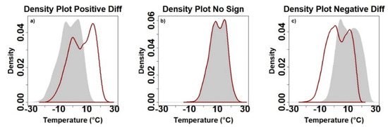 Density plot for temperature of (a) the highest positive difference, (b) no difference and (c) the highest negative difference between stations and ERA5. The grey area refers to the stations’ data and the red line refers to the corresponding ERA5 data.
