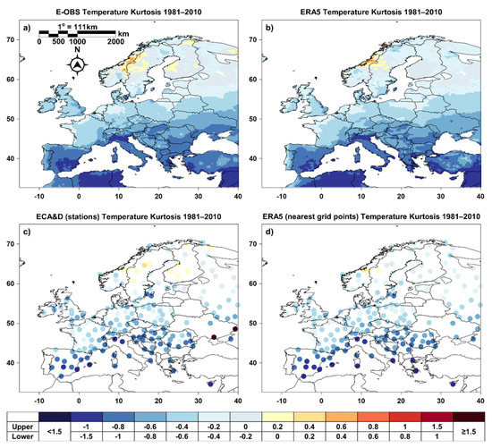 Temperature kurtosis excess for (a) E-OBS, (b) ERA5, (c) ECA&D stations and (d) the nearest to the stations grid points from the ERA5.