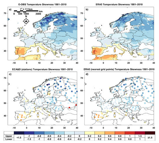 Temperature skewness for (a) E-OBS, (b) ERA5, (c) ECA&D stations, and (d) those nearest to the stations’ grid points from the ERA5.
