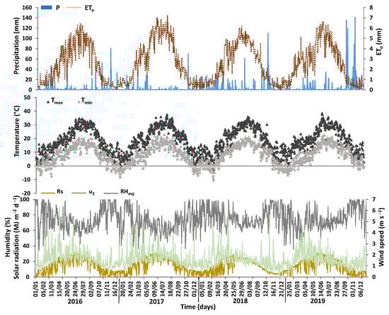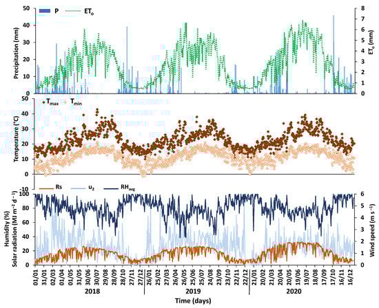 - Climatic data: daily weather data from local meteorological stations, namely the maximum and minimum temperatures (Tmin and Tmax, °C), minimum and maximum relative humidity (RHmax and RHmin, %), global solar radiation (Rs, MJ m−2 day−1), wind speed at 2 m height (u2, m s−1), and rainfall (P, mm) (Figure 1 and Figure 2).