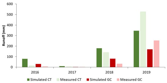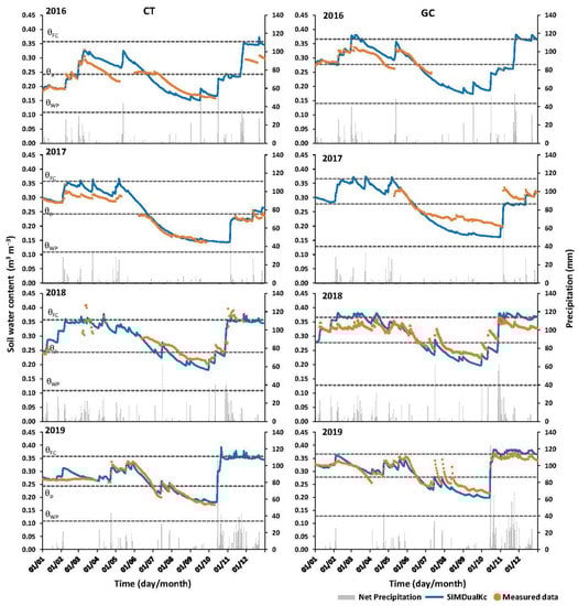 Simulated SWC were higher in GC plot relative to CT for all years, in agreement with the average of measured values. Likely, this would result from higher infiltration of rainfall water as already observed [,,]. Nevertheless, Novara et al. [], relative to a review of studies about the effects of a cover crop on SWC, reported that such effects often result in a decrease of soil moisture at a soil depth from 0–0.5 to 0–1.0 m, i.e., below the roots of the grass crop, between bloom and veraison, which can threaten yields in semiarid conditions.