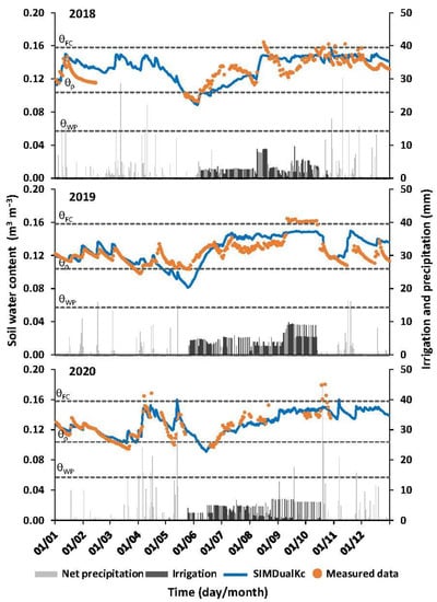 Figure 3 compares the SIMDualKc simulated soil water content (SWC) values in the root zone with daily measured SWC of Monferrato CT and GC plots during the years 2016–2019. Likewise, Figure 4 shows the measured and simulated SWC in the root zone of the Samora Correia vineyard during 2018–2020. Both figures further provide the dates and depths of rainfall events and, for the Portuguese vineyard, also of the irrigation dates and depths. Both figures show that the measured values of SWC were kept between θFC and θp during most of the year. In Monferrato, this fact resulted from precipitation, with large or successive events occurring during the autumn and spring, leading to SWC values temporarily above θFC. However, in the summer dry season, the soil moisture dropped below θp for some extended periods when rainfall was lacking. The year 2017 had the lowest SWC values as annual precipitation was uncharacteristically low during that year, amounting to only 493 mm. Indeed, among the last 20 years, 2017 was the least rainy one, with only 56% of the mean annual precipitation, while summer was very dry, with less than 25 mm of precipitation from the beginning of June to the end of August (the average for this period in 20 years is about 100 mm).