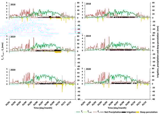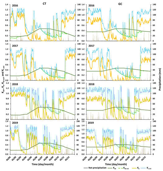 In Figure 5 are presented the daily values of the potential non-stressed basal crop coefficients (Kcb), the actual basal crop coefficients (Kcb act), the soil evaporation coefficients (Ke), and the actual crop coefficients (Kc act = Kcb act + Ke) computed by SIMDualKc. The rainfall events are also depicted in Figure 5. Table 8 presents then the components of the soil water balance in the Monferrato plots from 2016 to 2019.
