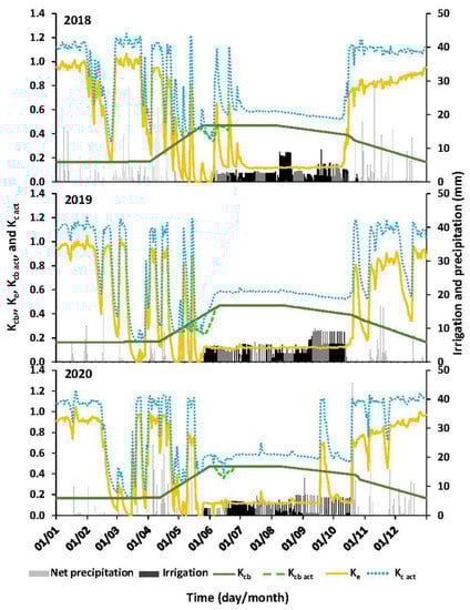 Soil evaporation is limited by the amount of energy available at the soil surface in conjunction with the energy consumed by transpiration, and by water availability in the surface soil evaporation layer [,]. The evaporation coefficient (Ke) is then computed as: