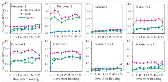 Mean porewater dissolved reactive P concentrations in unamended, alum-amended and gypsum-amended soil monoliths with time of flooding. The vertical bars indicate the standard deviation of the means (n = 3).