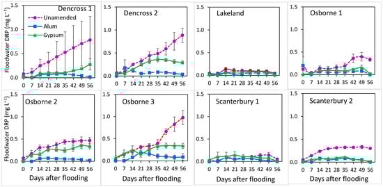 Mean floodwater dissolved reactive P concentrations in unamended, alum-amended and gypsum-amended soil monoliths with time of flooding. The vertical bars indicate the standard deviation of the means (n = 3).