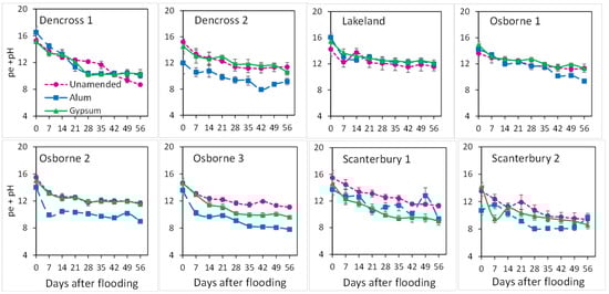 Change in pe + pH in unamended, alum-amended and gypsum-amended soil monoliths with time of flooding. The vertical bars indicate the standard deviation of the means (n = 3).