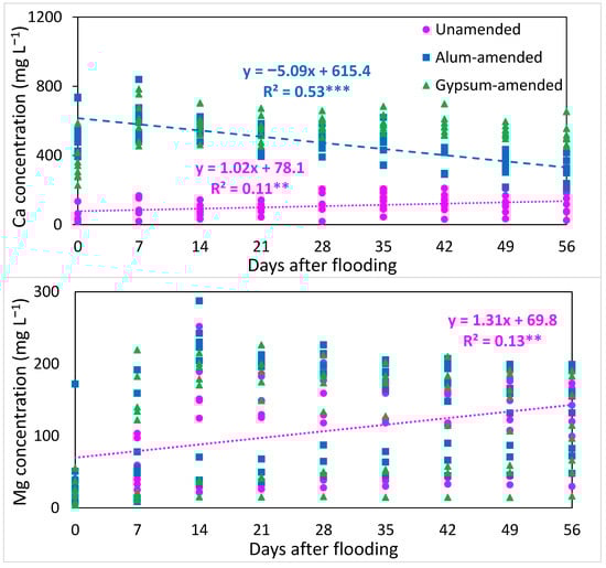 Relationships between days after flooding and porewater concentrations of Ca and Mg in unamended, alum-amended and gypsum-amended monoliths. Note: Linear relationships are shown only when significant at p < 0.05. Superscripts *** and ** followed by R2 indicates significant at p < 0.001 and p < 0.01, respectively (n = 72).