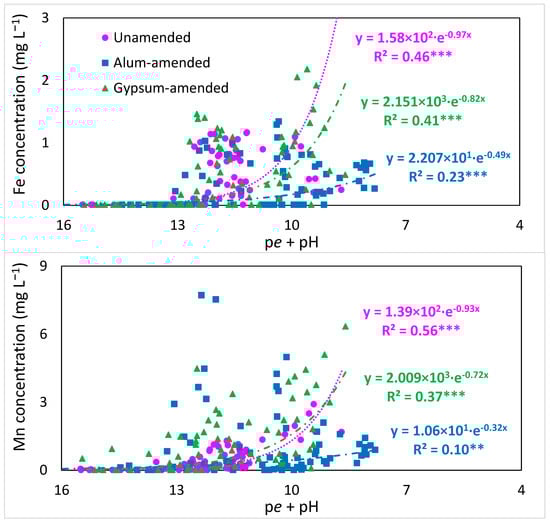 In unamended, gypsum-amended, and alum-amended monoliths, the decrease in pe + pH resulted in an increase in porewater Fe and Mn concentrations, and the relationship was exponential (Figure 5) and highly significant (p < 0.01). The concentrations of Fe and Mn were undetectable at the beginning of flooding when pe + pH values were above 12, however once pe + pH values decreased below 12, porewater Fe and Mn concentrations exponentially increased, with a greater increase in unamended and gypsum-amended monoliths than in alum-amended monoliths.