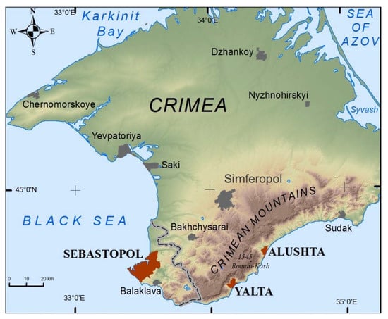 The seaside resort towns of Alushta (44°40′34″ N; 34°24′45″ E) and Yalta (44°29′46″ N; 34°10′13″ E) are located on the South Coast of Crimea (SCC), which occupies a strip of the Black Sea coast at the southern slope of the Main Ridge of the Crimean Mountains (Figure 1). The climate of the SCC is subtropical Mediterranean with average temperatures of +2.5 °C in February and 22.9 °C in July in Alushta and 4.2 °C and 23.2 °C respectively in Yalta []. Prevailing winds come from the east and southeast. Natural landscapes are represented by coastal xerophytic juniper-oak forests with Cambisols on eluvium-diluvium and eluvium of siltstones, mudstones, shales, limestones, and sandstones [].