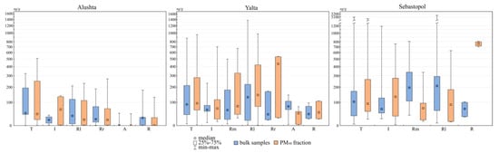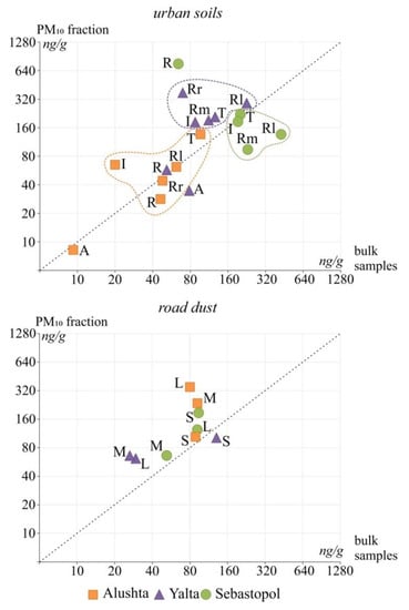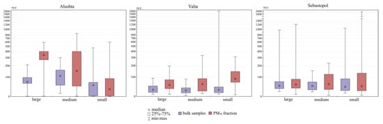 The dependence of pollutant accumulation on the type of use of urban areas has been confirmed by many studies [,,,,]. Pollution of soils and their PM10 particles is also different in the land use zones of Alushta, Yalta and Sebastopol (Figure 7).