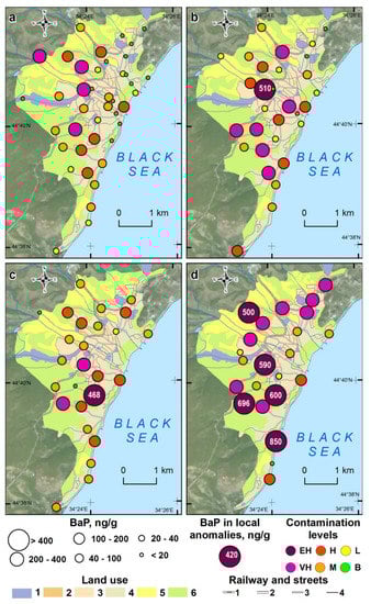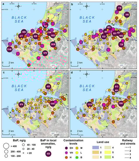 Distribution of BaP in soils (a) and their PM10 particles (b), road dust (c) and its PM10 particles (d) within the territory of Sebastopol. Contamination levels: EH—extremely high, VH—very high, H—high, M—moderate, L—low, B—background. Land use zones: 1—industrial, 2—multi-storey residential, 3—low-rise residential, 4—residential and recreational, 5—agrogenic, 6—recreational. Railway (1) and streets with: 2—large roads, 3—medium roads, 4—small roads.