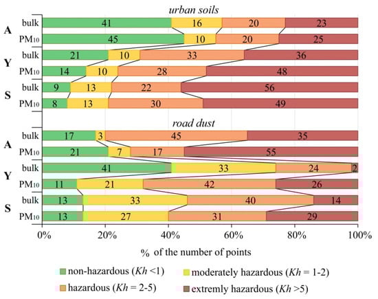 The environmental hazard of BaP pollution of soils, road dust or their PM10 fraction was assessed by comparing with the maximum permissible concentration (MPC) and calculating the environmental hazard coefficient Kh = Ci/MPC, where Ci is the concentration of BaP in soils, road dust or their PM10 fraction. Since the hygienic standards for road dust and PM10 particles of road dust and soils have not been developed, we used the MPC adopted for soils, which is 20 ng/g []. The Kh values were divided into five levels: <1—non-hazardous, 1–2—moderately hazardous, 2–5—hazardous, >5—extremely hazardous. These indicators are widely used for ecological and geochemical monitoring and assessment of the state of the environment in the Russian Federation.