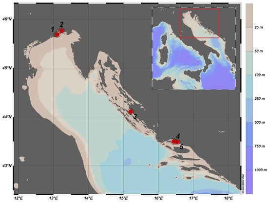 Sampling stations in the northern Adriatic Sea: Lignano Sabbiadoro (Gulf of Trieste, ITA) (1), San Giorgio di Nogaro (Gulf of Trieste, ITA) (2), Zadar Upov Centar (Zadar, HR) (3), Katalinića brig (Split, HR) (4), and Stupe (Split, HR) (5).