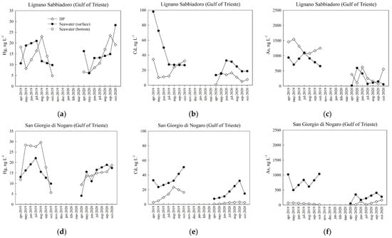 The Gulf of Trieste (Figure 2a,d) showed the maximum Hg value in mid-Summer 2019 (between July and August) and the last months of 2020. The dissolved Hg trend showed a similar pattern for DP and sea stations. In Zadar (Figure 2g), Hg content remained constant during 2019, decreased at the beginning of Summer 2020, and then reached the peak during August 2020. A similar situation occurred in Split (Figure 2l,o), where a minimum was recorded just before the beginning of Summer 2020 (April), and an increase occurred between May and July 2020. Considering depth, differences were evident only in Katalinića brig during the beginning of summer season and in Stupe at the end of it, with higher concentration recorded in bottom water (Figure 2l,o).
