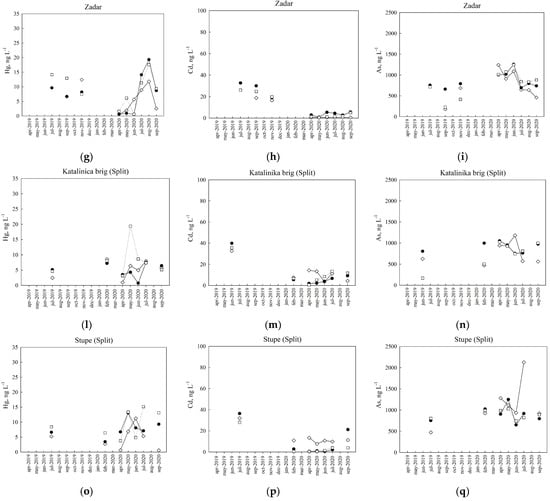 Dissolved Hg, Cd, and As (expressed as ng L−1, n = 3) in Lignano Sabbiadoro (a,b,c); San Giorgio di Nogaro (d,e,f); Zadar (g,h,i); Katalinića brig (l,m,n); and Stupe (o,p,q).