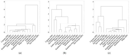 The cluster analysis applied to samples of 2020 showed a similar situation to 2019 (Figure 3c), since Croatian sites were grouped except for Stupe DP, mainly due to a higher average value of As (Table 3) compared to the other sites. The sites of the Gulf of Trieste were far from those of Croatia, and the most similar sites were still the seawater ones, as in 2019.