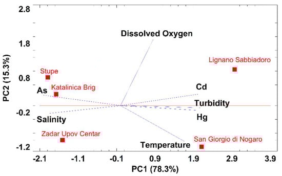 The first principal component (PC1, 78.31%) highlighted the difference between two different groups of samples: (i) the Croatian sites (negative scores) far from Cd and Hg as they showed a very low concentration of them but associated with the salinity and As parameters; (ii) the Italian sites (positive scores), associated with a higher concentration of Cd and Hg, but also the temperature and turbidity parameters (Figure 4). The second principal component (PC2, 15.32%) separated the sampling stations of Split (Katalinića brig and Stupe) and Lignano Sabbiadoro (positive scores) from San Giorgio di Nogaro and Zadar sites (negative scores), with dissolved oxygen and temperature parameters as the main driver (Figure 4). In our opinion, this component was mainly influenced by the different hydrodynamic behavior of the water masses in the sampling areas.