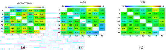 In the Gulf of Trieste, a statistically significant correlation was found between the following pairs: temperature–turbidity (p = 0.0007), dissolved oxygen–salinity (p = 0.0025), Cd–salinity (0.0371), As–salinity (p = 0.0021), dissolved oxygen–As (p = 0.0044), and Cd–As (p = 0.0066) (Figure 5a). In Zadar, the pairs of variables showing a statistically significant relationship were temperature–dissolved oxygen (p = 0.0196), Hg–As (p = 0.0119), and Cd–As (0.0048) (Figure 5b). In Split, a statistically significant correlation was found between the following pairs: temperature–dissolved oxygen (p = 0.0327), Cd–As (p = 0.0055), and Cd–temperature (p = 0.0170) (Figure 5c).