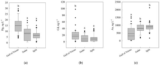 In this study, dissolved PTEs were detected with an overall mean concentration of 15 ± 7 (Hg), 20 ± 19 (Cd), and 458 ± 442 (As) ng L−1 in the Gulf of Trieste; 8 ± 6 (Hg), 9 ± 11 (Cd), 801 ± 283 (As) ng L−1 in Zadar; and 7 ± 4 (Hg), 10 ± 11 (Cd), and 883 ± 295 (As) ng L−1 in Split. The Gulf of Trieste presented statistically significant higher levels in Hg (p < 0.0001) and Cd (p = 0.0013) compared to Croatian samples, while a lower concentration in As (p < 0.0001) was detected (Figure 6).