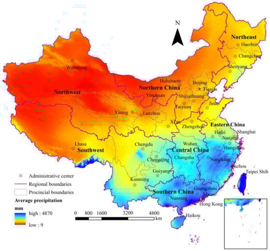 Based on the characteristics of geographic location, physical geography, and human geography, China is typically divided into seven regions: Northeast, Eastern China, Northern China, Central China, Southern China, Southwest, and Northwest [54] (Table 1). Figure 1 presents the average annual precipitation amount of China’s seven regions, showing that it varies significantly. The overall improvement of WRM in different areas is of great significance to maintain regional stability and sustainable development.
