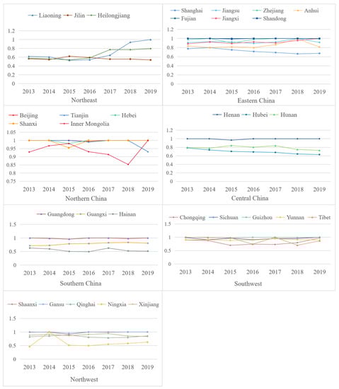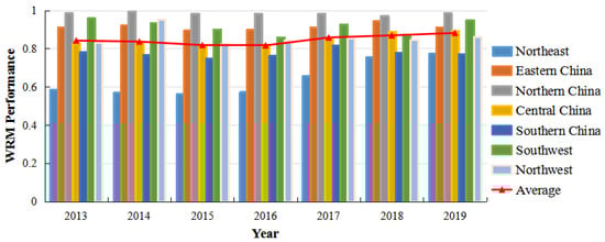 Second, WRM performance was shown to be spatially different (Figure 3). The red poly-line in Figure 3 shows the national 7 year average of WRM performance. The national 7 year average of WRM performance remained above 0.8. The WRM performance of Central China was nearest to the national 7 year average performance and their trend of change was also roughly the same. In contrast, the WRM performance of the three provinces in the Northeast region showed an upward trend for seven years and greatly improved to greater than 0.5 in 2018 and 2019. However, the overall performance of the region was below the national average for WRM performance. Compared with the substantial increase in the Northeast, WRM performance in Southern China was relatively stable, fluctuating near 0.8, which is also lower than the national average performance. WRM performance in Eastern China, Northern China, and Southwest China fluctuated between 0.7 and 0.8, exceeding the national average performance, and the fluctuation trend was the same. Among them, the provinces in South China and North China are more economically developed, with better market mechanisms and relatively fierce market competition; therefore, the resource input has already shifted to an intensive type.