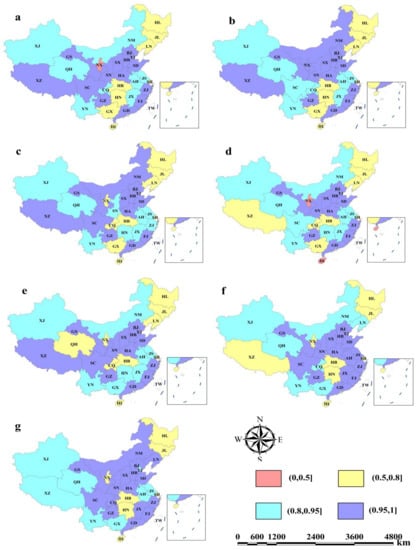 Spatial distribution of the WRM performance in the 31 provinces of China from 2013 to 2019 ((a–g) represents the year 2013–2019, respectively).