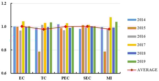 Based on the input–output variable panel data of the 31 provincial administrative regions in China from 2013 to 2019, Software DEAP2.1 was used to calculate the Malmquist productivity index for each region. Figure 5 show the total factor productivity index and its decomposition results for different years, respectively.