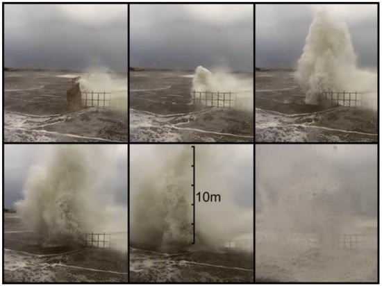 Many coastal cities also experience wave overtopping and sometimes experience damages of coastal structures annually, during the Pacific typhoon season (roughly falls between July and September). For example, Taiwan is vulnerable to the pathways of typhoons mostly from the Western North Pacific with, on average, 5.3 typhoon landfalls per year (from 2007 to 2016). Taiwan’s coastline is roughly 1338 km, in which the “artificial” coastline is more than 750 km, i.e., covered with artificial structures, indicating a high density of coastal structures constructed along the coasts. Such man-made structures are mostly vertical and steep seawalls protected by a large amount of armor blocks. However, such seawalls are sometimes smashed by wave actions. In August 2015, massive and long waves due to the Typhoon Soudelor (Category 5) led to the nationwide wave overtopping of seawalls and destroyed part of the breakwaters at the Fugang Fishing Harbor in Taitung (a city in the east coast of Taiwan); in September 2016, the same harbor was struck by the Typhoon Meranti (Category 5), which introduced long waves more than 10 m high for wave overtopping and devastated the outer embankment as well as the lighthouse. In Figure 1, the photographs document dramatic wave-overtopping processes at Anping, Tainan City, Taiwan. Although there were no direct in situ measurements, it is speculated that the waves that led to overtopping flow were of substantial size and resulted in sea sprays rising several tens of meters into the air, where one of the possible mechanisms to produce such an exceptional flow might be attributed to strongly amplified wave impinging the harbor wall, and then resulted in the proceeding wave overtopping. As indicated in [], the design and risk assessment of coastal structures has been changed in the past decade to allowable overtopping instead of wave runup. Therefore, understanding the hydrodynamic characteristics of breaking waves on seawalls has become increasingly important for the safety and future planning of coastal communities.