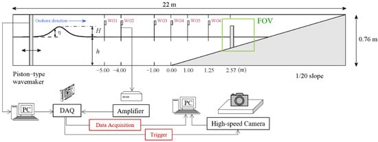 In the present study, the BIV raw images were captured using a high-speed camera (MS55K2, Canadian Photonic Labs Inc.) mounted with a Nikon 60 mm f/2.8 focal lens. In the experiment, the camera resolution was set at a full resolution of 1280 × 1020 pixels with a framing rate at 1000 fps. The distance (l) from the camera lens to the measuring plane was 180.0 cm and the field of view was 42.4 cm × 33.9 cm; the calculated DOF was around 14.6 cm. The corresponding error due to the limited depth of DOF can be estimated by ε = DOF/(2l) []. As a result, the error caused by the limited DOF in the BIV system was around 4.06%. To provide the mean flow properties and reduce the error of the BIV system, the measured results shown here, including velocity fields and wave gauge data, were obtained by ensemble-averaging over 30 (for the case of H/h = 0.46) and 35 (for the case of H/h = 0.30) instantaneous trials under identical initial and boundary conditions. The reason to increase the number of repeated experimental runs for the case of H/h = 0.30 was that the captured images were of limited shadow textures during the phases of waves impacting on the wall, such that increasing the number of trails helped reduce the random error for the ensemble-averaging process. The Reynolds-decomposition method was then used to separate velocity fluctuations and to statistically obtain the turbulence characteristics. The turbulent kinetic energy (K) can be estimated by , in which the symbol represents ensemble average, N is the number of repeated experiment (N = 30 and 35, depending on scenarios), and , respectively denotes the horizontal and vertical velocity fluctuations. The whole measuring system and instruments were synchronized by using a data acquisition system (DAQ, National Instruments) along with an in-house developed LabVIEW program—as the wavemaker started generating a solitary wave, a signal was sent to the DAQ device to start data recording of connected instruments and the high-speed camera was then triggered to start through a predetermined delay time in order to skip unnecessary image recording until the target wave was in the vicinity of the vertical seawall. Figure 2 shows the sketch of synchronized instruments and the image-based measuring system.