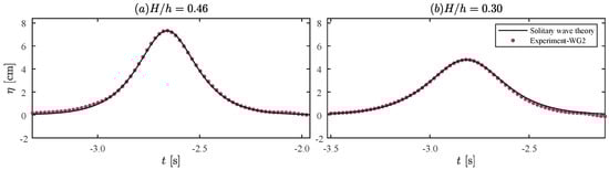 Comparison in terms of a wave-profile time series between ensemble-averaged measurements at WG2 and the third order theoretical solution of solitary waves [] for the cases of (a) H/h = 0.46 and (b) H/h = 0.30.