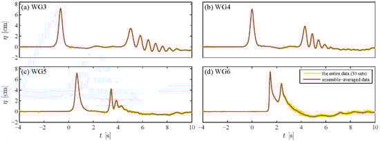 Measured time history of free surface elevations at the four locations, for the case of H/h = 0.30.