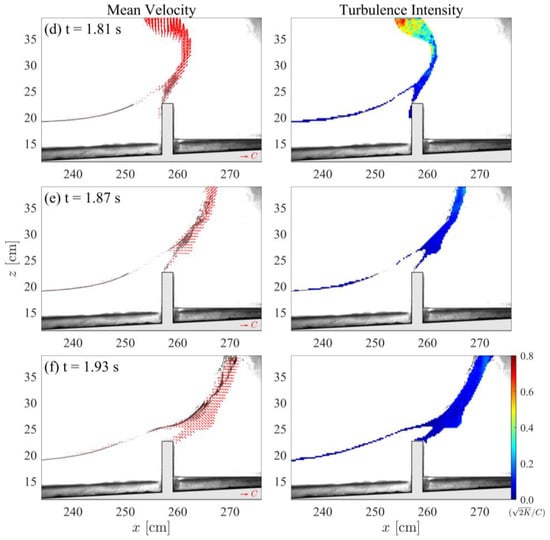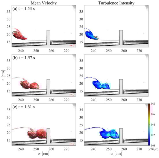 Figure 5 shows the velocity and turbulence characteristics obtained from the BIV analyses. For clarity, only every 2nd velocity columns are plotted using a regularly spaced grid. Specifically, the left column of Figure 5 shows the mean velocity fields obtained from ensemble averaging over 30 repeated instantaneous BIV measurements, while the right column of Figure 5 demonstrates the turbulent kinetic energy (K) by means of the turbulence intensity (), which is normalized by the wave celerity (C) of a solitary wave based on the Boussinesq theory [], i.e., C =. For the case of H/h = 0.46, the phase velocity is equal to C = 1.50 m/s. In addition, the background images are arbitrarily selected from one of the 30 realizations. Due to the highly turbulent nature of breaking waves, slight mismatches at some instances between the mean velocity field and instantaneous image should be expected [].