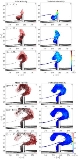Ensemble-averaged velocity fields (left column) and normalized turbulence intensity (right column) superimposed with instantaneous background images, for the case of H/h = 0.46, at (a) t = 1.53 s, (b) t =1.57 s, (c) t = 1.61 s, (d) t = 1.65 s, (e) t = 1.69 s, (f) t = 1.73 s, (g) t = 1.77 s, (h) t = 1.81 s, and (i) t = 1.85 s.