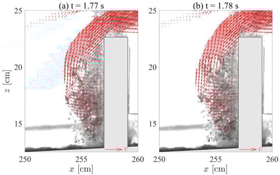 Flow-velocity fields around the toe of seawall are of concern, as related to wave-induced seawall scour []. In Figure 6, a closer view near the front side of the seawall is presented. A clockwise-rotating vortex is observed in front of the seawall because of the overturning wave that entrains air bubbles. This vortex then moves downward to the intersection of the slope and the seawall, which may be a reason for the possible scour of the structure’s foundation. Since the flow fields were only measured for aerated regions in this study, detailed flow characteristics for the entire area cannot be obtained. This deserves further investigation via simultaneous measurements using PIV and BIV, such as in [], to facilitate an understanding for such complicated phenomena.