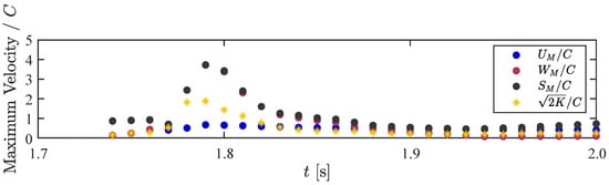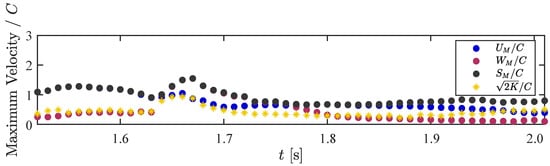 Based on the measured velocity and turbulence fields, the maximum horizontal velocities (), maximum vertical velocities (), maximum speed () and maximum turbulence intensity () are extracted at each time instant over the entire set of measurements. Noted that is defined as , where and denotes the horizontal and vertical velocities, respectively. Figure 7 shows the time history of the maximum velocities normalized by the wave celerity. Clearly, the wave-breaking process is dominated by the horizontal velocity and, after the plunging breaker has fully developed, the horizontal velocity starts to decrease. The maximum horizontal velocity during wave breaking is 1.3 C. This value is close to those of deep-water breaking waves, such as 1.5 C [] and 1.4 C [,]. Transferring the dominating momentum from horizontal to vertical is triggered by the up-rushing sprays due to wave-structure interaction, where the maximum vertical velocity is around 1.8 C. The measured velocity caused by the vertical jet is lower than those reported in [,] for deep-water breaking wave impacts on floating structures, i.e., 2.9 C and 2.8 C, respectively. Such differences may be partly due to the use of different generating mechanisms of breaking wave and types of vertical structures.