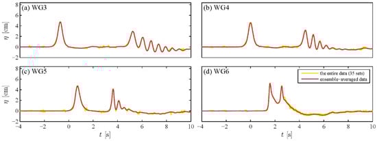 Figure 4 shows the free-surface elevation time series obtained from WG3 to WG6, for the case of H/h = 0.46. The WG3 was positioned in the constant depth region such that its main waveform is not affected by either the slope or the vertical wall until wave reflection was recorded, i.e., t > 4.0 s [Figure 4a]. The WG4 was exactly located at the toe of the slope such that the waveform becomes a bit asymmetric due to the presence of the slope [Figure 4b]. The shoaling effect becomes more prominent from the recording of WG5, in which the waveform turns into a more asymmetric shape to form a nearly vertical front [Figure 4c]. Lastly, WG6 was deployed just 1.32 m in front of the seawall and thereby its location is close to the breaking point of the shoaling wave. The definition of breaking point is where the wave crest starts to curl up. From WG6 recording the leading waveform features an almost vertical front. In Figure 4d, a second peak is recorded at t > 2.0 s due to wave reflection from the wall, in which the reflected wave height is roughly 0.7 times the incident wave height. For this case, wave breaking occurs prior to wave impacts on the seawall, such that energy dissipation should be expected and wave overtopping also leads to energy loss. As such, it is therefore reasonable to have partial wave reflection for this case. In addition, because the same experimental condition was repeated up to 30 times for this scenario. The entire dataset and the ensemble-averaged data can be shown together. It is acknowledged here that the criterion to ensure the data quality is based on the standard deviation for the data obtained from WG3 and its difference in terms of the wave height should be less than 2% before the data can be collected. It is found that the entire dataset, up to 30 repetitions, fit the ensemble-averaged data satisfactorily well. Noticeable variations are only observed for the recording from WG6 during the phase of wave reflection due to the breaking wave impacting on the vertical wall, which is the most complicated phenomenon in this study. Otherwise, the fit of the entire dataset shows a high degree of repeatability for the present measured data.