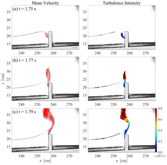 Figure 9 shows the ensemble-averaged velocity fields along with the normalized turbulence intensity for six selected time instants. As mentioned, this case is of a relatively smaller wave height, so the limited air-bubble entrainments of the breaking wave prior to its impacts on the wall can be expected. Limited air-bubble entrainment is associated with limited tracers for velocity determination using BIV. As such, this experiment was repeated up to 35 times in order to have more samples to reduce the random errors caused by the image-based measuring system.