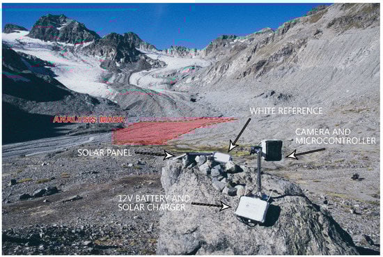 The time-lapse images were captured with a Nikon D300 digital single-lens reflex camera mounted inside a waterproof housing set up on top of a boulder near the glacier forefield (Figure 1c and Figure 2). While the camera aperture (f 8.0), white balance (5560 K), sensor gain (ISO 200) and focus (infinite) were set manually, changing light conditions required a variable integration time that was automatically adjusted by the camera.