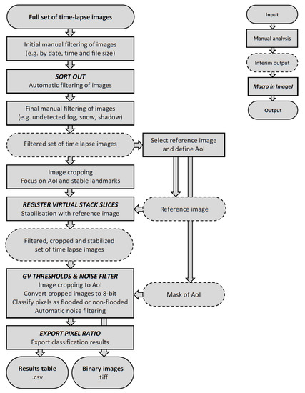 The workflow applied for the image analysis is shown in Figure 3 as a schematic flowchart. In a first step, the annual subsets of digital RGB color images were manually examined for defects and quality to meet storage space requirements for the ensuing automated analysis process. This was followed by an automated quality filtering in the image processing program Fiji, a distribution of the open-source software ImageJ (version 2.0.0-rc-69/1.53c; Java 1.8.0-172) [30]. Therein, user-defined macros enabled image processing and analysis. Consequently, we designed back-to-back macros (Scripts S1) capable of extracting pixel-based information to identify inundated areas in the camera view.