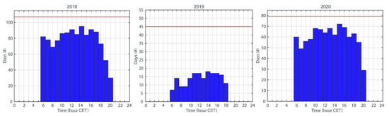 The number of days with recordings for a given hour of the day in the final analysis after sorting and processing. The red line shows the maximum number of days between the first and last recordings of the respective year.