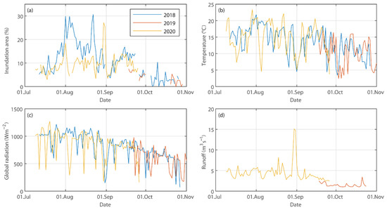 Daily maximum of (a) the detected inundation area relative to the AoI, (b) air temperature, (c) global radiation and (d) runoff for the three observation periods between 2018 and 2020 (also see Table S2).