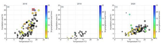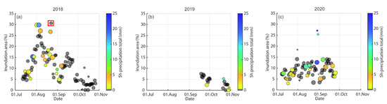 The inter-annual evolution of the inundation area is presented in Figure 7. In the 2018 data set, the highest IAdmax values of about 30% were recorded at the beginning of August. This coincided with high levels of meltwater discharge and additional convective precipitation, represented in the shape of large circles (high global radiation) and the precipitation-indicating coloring. Towards the end of August and throughout September, the IAdmax values fell consistently below 20%, while even days with high global radiation and convective precipitation did not result in increased IAdmax values. In addition, no precipitation was recorded from mid-September to the end of the observation period at the end of October, and global radiation generally decreased. As a logical consequence, the IAdmax values continued to decrease as the season progressed, to below 5% at the end of October.