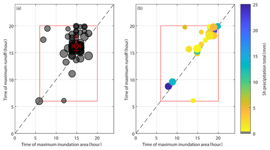 Time of the daily maximum inundation area (IAdmax) plotted with the time of maximum runoff in 2020 for days (a) without precipitation and (b) with precipitation within 5 h prior to the recorded IAdmax. The color scheme in (b) relates to the total precipitation 5 h prior to recordings. The circles are sized accordingly to the daily maximum values of global radiation. The red box marks the time frame of available camera recordings.