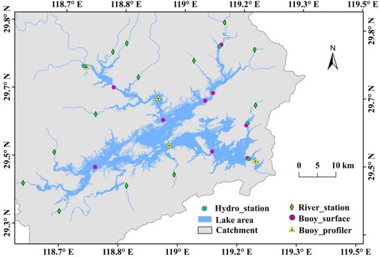 The HFMS at Lake Qiandao includes thirteen river stations; fourteen buoy stations—including ten buoys measuring the surface WQ (Buoy_surface, model EMM700, YSI Incorporated, Yellow Springs, USA); four ‘profiler’ buoys (Buoy_profiler, model EMM2500, Yellow Springs, USA); four hydrological stations (Hydro_station)—these were deployed at the three main tributaries and the only river outflow and measure water current speed; and four flux stations (Flux_station, model Tenghai HZF3, Tenghai Science & Technology Ltd., Hangzhou, China), located alongside the hydrological stations, measuring WQ parameters. There are also thirteen river stations (River_station, model EMM700, YSI Incorporated, Yellow Springs, USA) measuring WQ, deployed at the main inflow tributaries. Meteorological sensors (Met_station) are deployed at the top of each buoy station, except for one site (Figure 1). The Buoy_profilers were deployed at sites 1–4. The profiling information at site 3 is representative of the lake because it is at the centroid, while site 4 is the deepest monitoring point, which is located at the biggest outflow channel. Sites 5 and 6 with Buoy_surface are near the middle, capturing surface WQ variation.