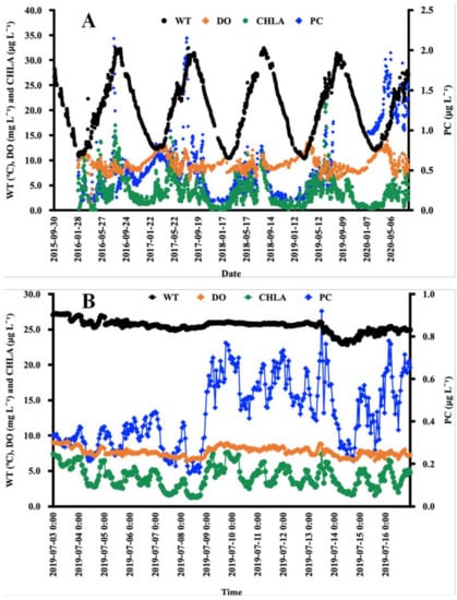 Time serials of (A) daily and (B) hourly WT (black dots, ℃), DO (orange diamonds, mg L−1), CHLA (green dots, µg L−1) and PC (blue diamonds, µg L−1) at site 5. Left Y-axes is for WT, DO and CHLA, and right Y-axes is for PC. X-axes is for date in format of year-month-day.