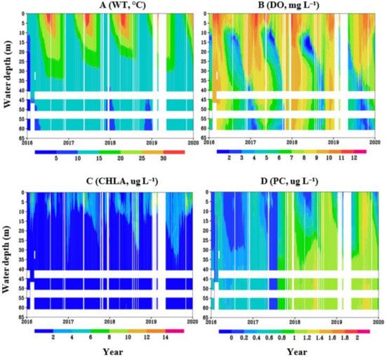 Profiles of WT, DO, CHLA and PC at site 4 (deepest area) for 1 January 2016–10 July 2020 are shown in Figure 4. The maximum measurement depth was 65 m at this site. WT (Figure 4A) profiles show a monomictic pattern of mixing with thermal stratification in summer and mixing in winter, although some periods and layers lacked measurements. The TDs were 9.2 m, 9.4 m, 12.1 m and 7.8 m in the summer (July–September) of 2016, 2017 and 2018 and July of 2019 (data not available in August and September). The TD in 2018 were greater than other years, which suggests that the stratification in the summer of 2018 was more intensive than in 2016, 2017 and 2019. Correspondingly, bottom hypoxia events were observed during the stratification of all years. Average bottom DO values (Figure 4B) during stratification were 7.0 mg L−1, 7.7 mg L−1, 8.2 mg L−1 and 7.7 mg L−1 in 2016, 2017, 2018 and 2019, respectively. The lowest DO values were 1.0 mg L−1, 2.0 mg L−1, 1.6 mg L−1 and 2.9 mg L−1, observed on 4 April 2016, 9 December 2017, 1 January 2018 and 13 January 2019, respectively.