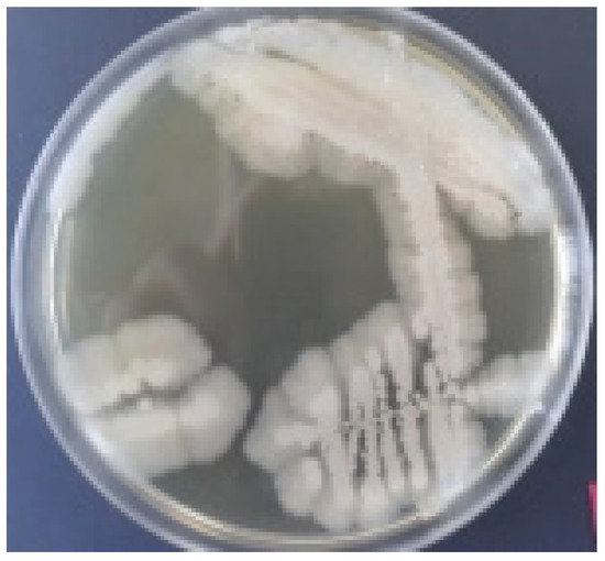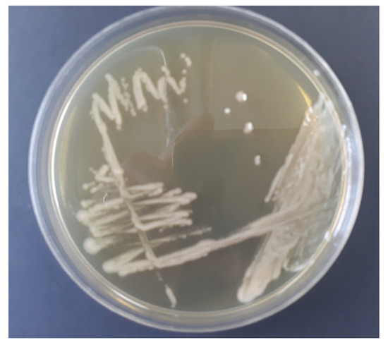 BFL 6000HC is a well-known bioremediation solution that contains different microorganisms which produce certain enzymes able to degrade aliphatic, aromatic, and polar compounds from the environment, especially from hydrocarbons containing soils [29]. Due to the lack of information on the type of microorganisms present in BFL 6000HC, the lyophilizate was hydrated and inoculated into the plate in a solid LB medium to isolate and identify the existing bacterial strains. After the incubation period, the colonies formed were separated and plated on Petri dishes. Two types of colonies with different morphology appeared after the incubation period (Figure 2 and Figure 3).