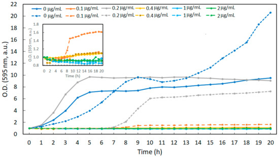 For each isolated and identified bacterial species, a cell growth curve was performed in the presence of different OTC concentrations (Figure 5) to establish the influence of antibiotic concentration on their development.