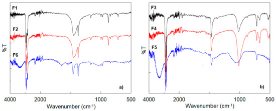 - Polyethylene (Figure 7b)—the peaks at 2830 and 2915 cm−1 are due to symmetric and asymmetric stretching vibrations of —CH2—, 1468 cm−1 due to —CH2—bending deformation, and 718 cm−1 due to CH rocking deformation [41,42]. The low absorption (for F3 and F4) or the absence of the absorption (for F5) at 1373 cm−1 (due to methyl CH3 vibration groups) is a clear indication that the filter materials are based on high density polyethylene (HDPE). The FTIR bands at about 670, 1000 cm−1 (for F3 and F4) could be assigned to the presence of chlorine in the material structure, and the band a 3310 cm−1 (for F5) is assigned to bonded OH due to material ageing [43].
